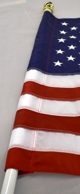 This US Nylon Banner Kit comes complete with a 2 1/2’x4’sewn, sleeved nylon US Flag, 5′ 1-piece mahogany pole, and multi-position, cast aluminum bracket with screws. The flag is 100% made in the U.S.A. The product Number is 99080.